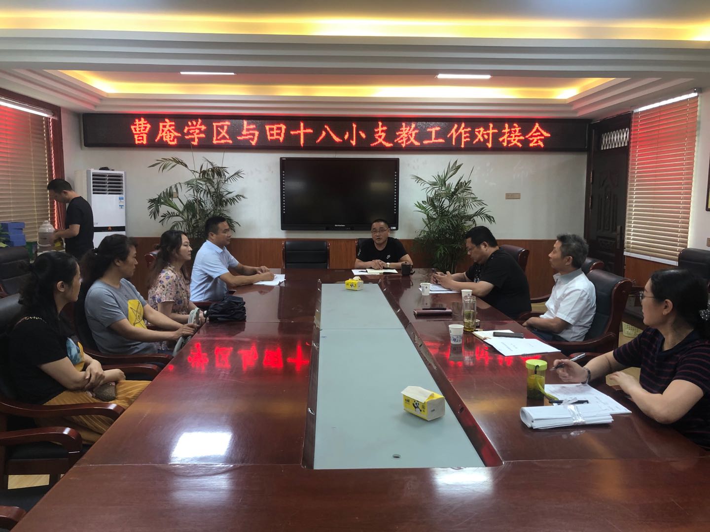 2020年6月15日下午,田区十八小张洁、张娟、喻莉等5位不同学科的骨干教师前往曹庵中心小学参加曹庵学区与田十八小支教工作对接会议,受到林永胜校长和其他五位校长的热情迎接。在对接会议上,林校长首先详细介绍了曹庵学区的学校布局、师资队伍、学生班级等情况,对本次交流支教工作的开展提供保障并充满信心,希望田十八小支教老师能够把支教工作做实、做细、确保课时,通过两年的支教工作让受支教的老师和孩子受益,形成支教成果。王君做为十八小带队老师,在会上表示一定会按照南部片区支教方案和工作要求做好交流支教工作,根据不同的学情加强教学、教研学习,希望通过本次支教工作的开展相互促进、共同成长。