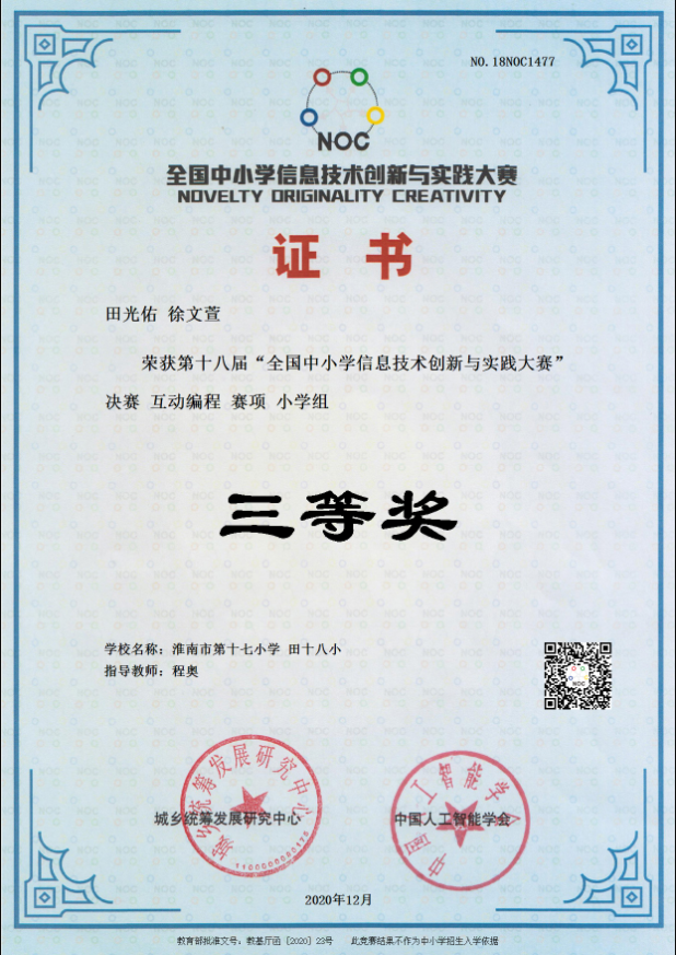 2020年12月6日,在日照举行的第十八届全国中小学信息技术创新与实践大赛(NOC)决赛传来喜讯,田家庵区第十八小学徐文萱同学通过层层选拨,最终脱颖而出,获得全国三等奖的好成绩!