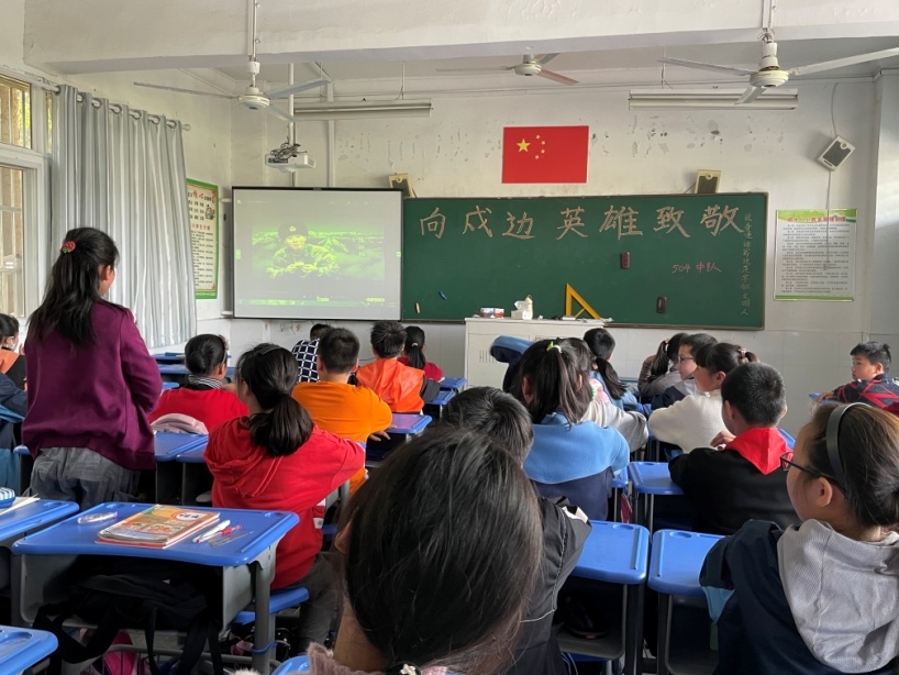 在主题班会课上,老师向同学们介绍了将士英雄的英勇事迹,同学们跟随着视频了解到戍边战士的防卫事迹,深刻感受到将士们为了保家护国的不畏艰险,不惧危难的意志和精神,也明白到正是英雄战士用自己的身体为我们筑起一道坚实的城墙,才有我们今天的安稳与和平。