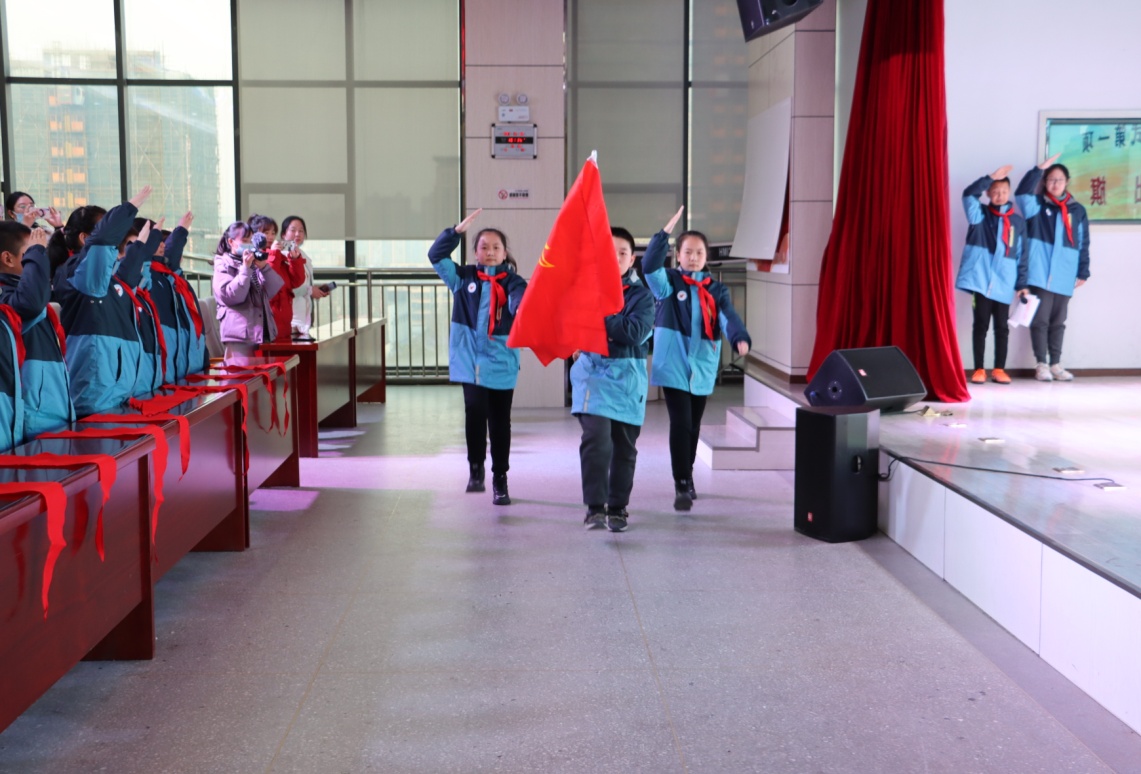 在这次入队仪式上,一年级第一批共计90名同学光荣地加入了少先队这个大集体。在熟悉的少先队出旗曲中,护旗手们踏着整齐的步伐进行着庄严的出旗仪式,少先队入队仪式由此拉开帷幕。紧接着,同学们齐唱中国少年先锋队队歌,嘹亮的歌声表达了对少先队组织的热爱。随后,老队员们细心地为新队员系上鲜艳的红领巾,新老队员互敬队礼,校领导为一年级五个中队授中队旗。