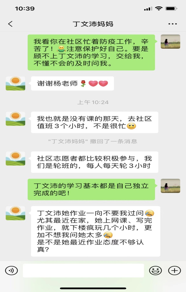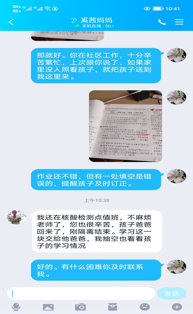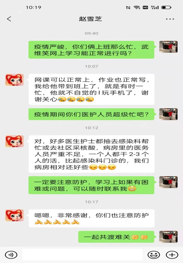 2022年3月底,面对一场突如其来的疫情,学校一方面执行上级防控指挥部的规定,严格做好学校疫情工作,一方面落实“停课不停学"工作要求,妥善做好疫情期间防疫一线人员子女、困难家庭子女、留守儿童、随迁子女、重点疫区学生等特殊学生帮扶工作,切实帮助解决其居家学习生活所面临的实际困难,让特殊学生感受到学校的关爱。各班主任老师通过多种渠道调查了解他们的居家上网、学习、生活、心理等情况,开展温馨关爱行动;任课老师通过视频、电话、微信等方式了解特殊学生学习情况、体育锻炼、解决实际困难、帮助释疑解惑,同时,及时掌握和关注他们的心理健康,对需要的学生进行心理疏导,缓解紧张焦虑情绪。