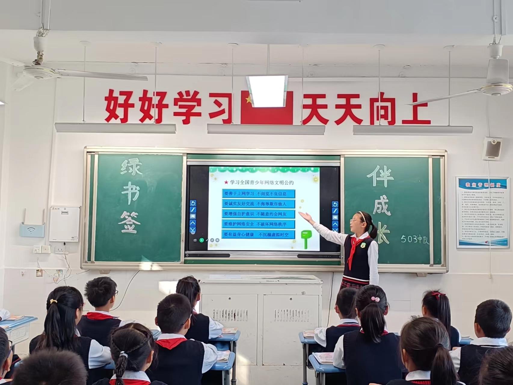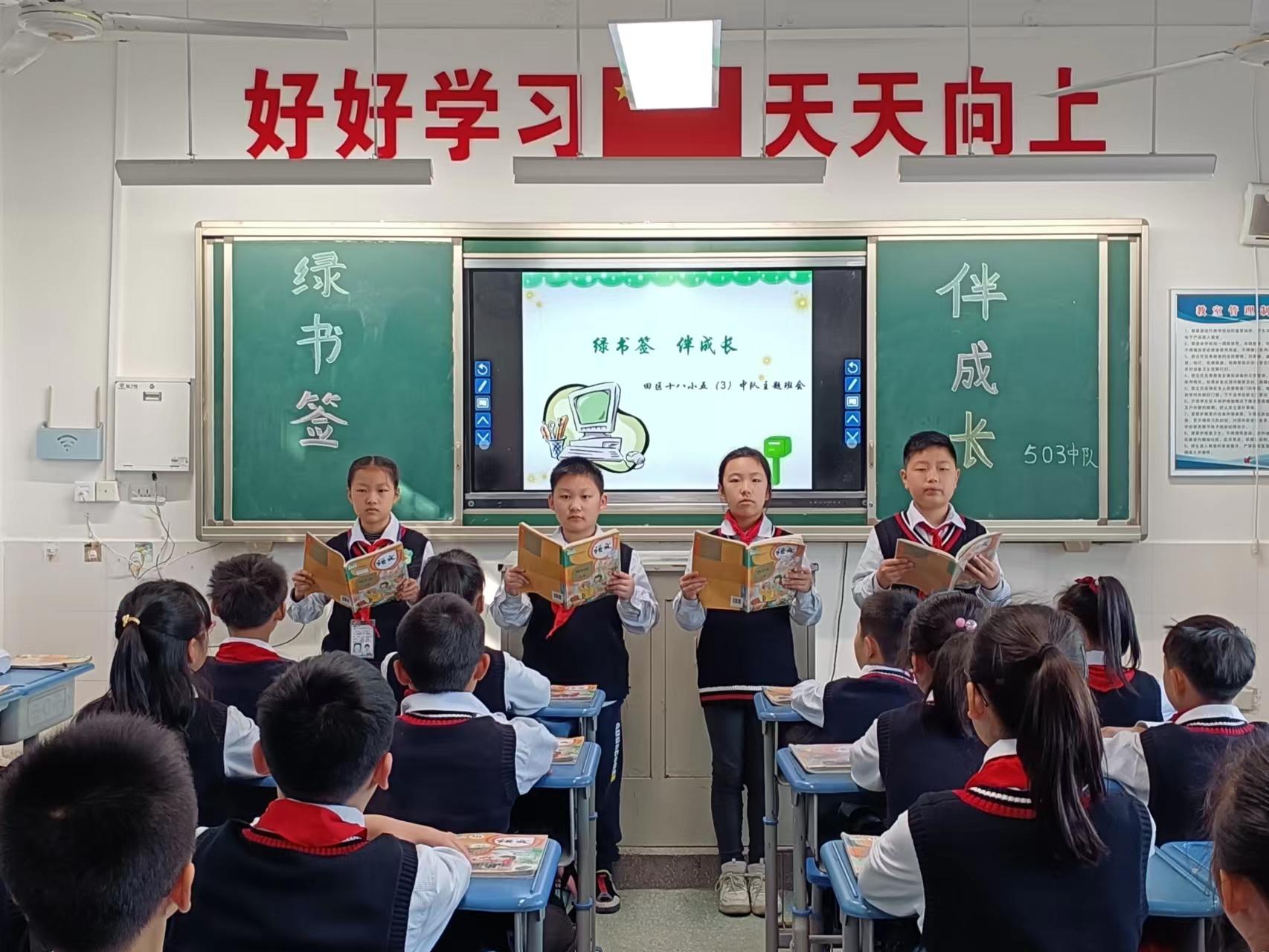 班会上,中队辅导员老师倡导同学们通过阅读经典书籍汲取奋进的思想力量,拓宽视野,增长见识,陶冶情操,扣好人生“第一粒扣子”。让学生们注意阅读正版书籍、分享阅读心得,引导他们在生活中文明上网,让绿色阅读成为习惯。同学们齐声诵读《少年中国说》、《延安,我把你追寻》等经典诗文,进行阅读分享,并互相推荐优秀读物。