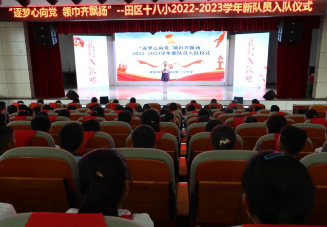 领巾齐飘扬”一年级新生入队仪式。火红的队旗高高飘扬,鲜红的领巾系满理想,小队员们在少先队的引领下,成为一名光荣的少先队员。