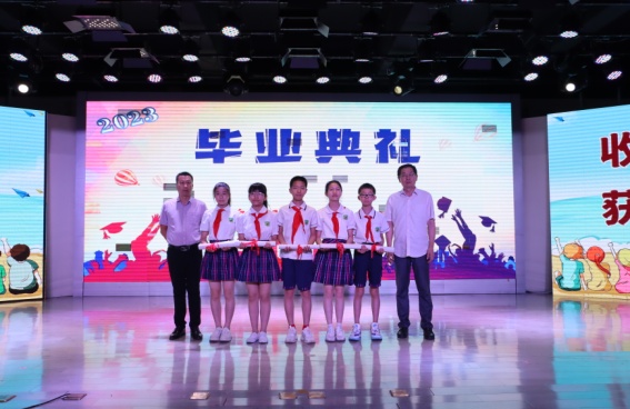 优秀毕业生代表为全体六年级老师献上了鲜花,钱刚校长、刘本伍副校长为毕业生颁发了毕业证书。最后,在悠扬的歌声中,全体领导与老师目送毕业生离场,毕业典礼圆满结束。相信每一位同学都会带着学校和老师给予他们的希望和牵挂,开启初中三年的美好征程。