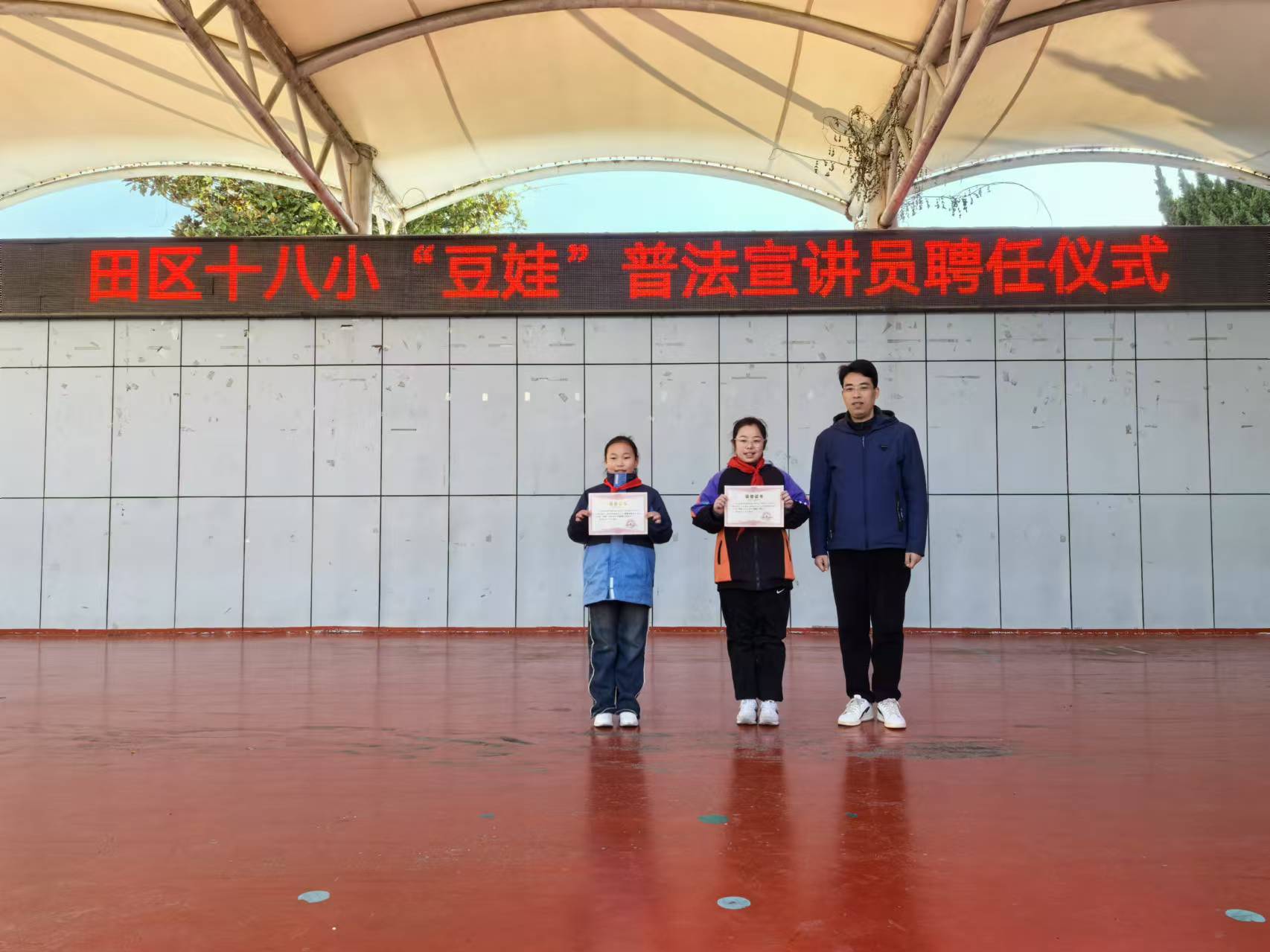 1116日上午,田区十八小举行“学宪法、讲宪法”演讲比赛颁奖典礼。总务处崔娇主任宣读演讲比赛获奖名单,党支部书记、校长苏国岩、党支部副书记刘本伍、副校长李莉、王君为获奖选手颁发证书,同时聘请获奖选手成为田区十八小“豆娃”普法宣讲员。