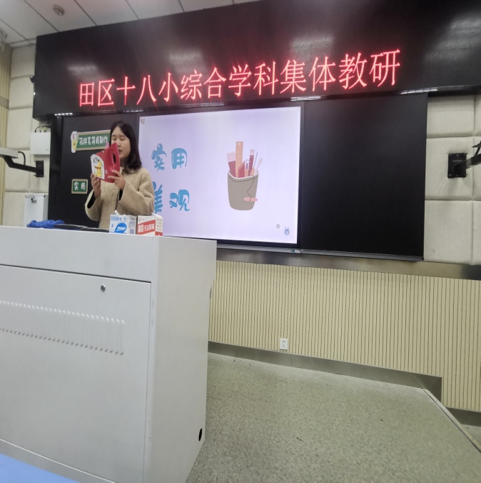 孙格格老师首先详细阐述了本节课的教学要求及教学目标:学生能利用身边可搜集的废旧材料制作美观实用的笔筒,在制作过程中体验创新、探究的学习乐趣,“变废为宝”培养学生的环保意识。孙格格老师细致讲解了本课的重难点后出示课件并展示教学过程,结合“教--评”一体化的教研探讨主题,展现在授课中如何让学生积极参与,激发创造力,让环保理念深入人心。在分享了授课经验的同时,孙格格老师也对本节课进行了总结反思,她认识到在教学过程中,也存在一些不足之处,在今后的教学中将进一步加强引导,鼓励学生大胆创新,不断改进课堂教学,提高教学水平。